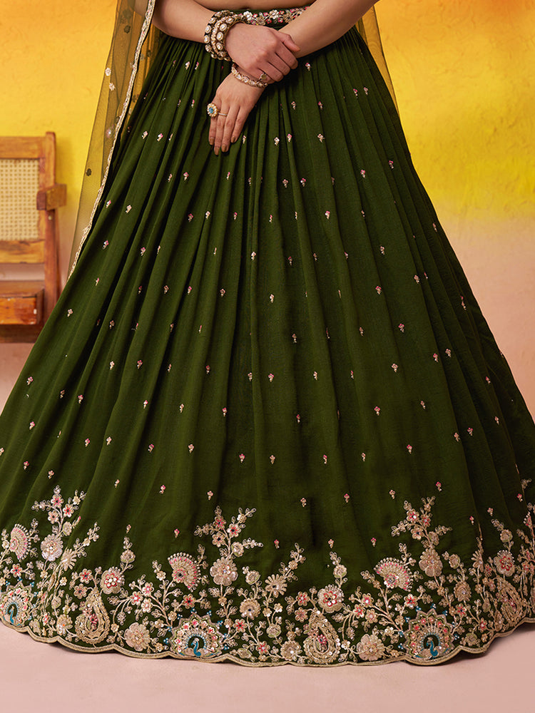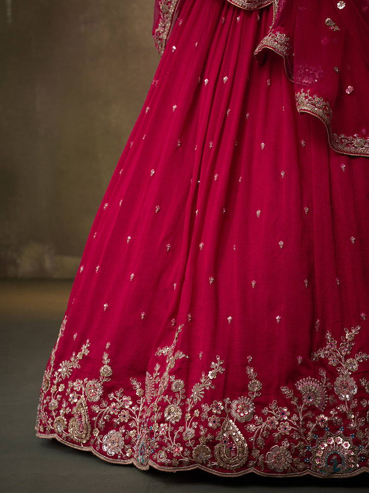 Made of premium quality Georgette fabric Full Flair Semi-Stitched Pleated Lehenga With Moti, Sequinse and Coding work has a thread Embroidery work. Has a thread work border on the hemline.