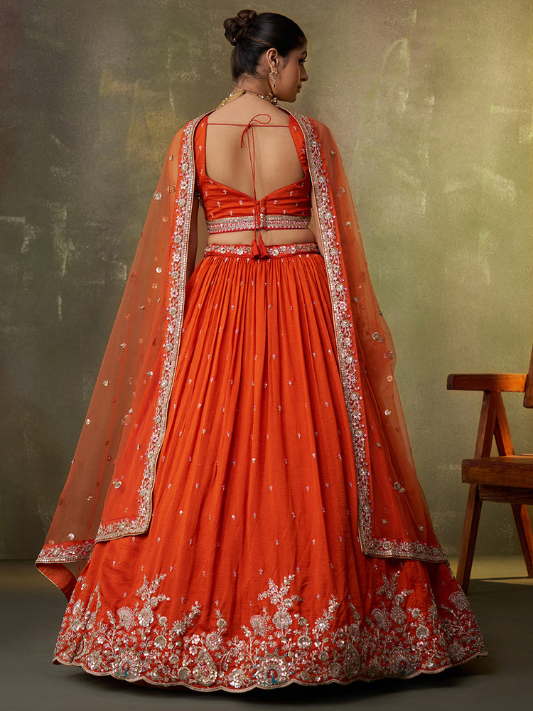 ORANGE - Georgette Fabric Sequins Thread & Embroidery Semi-Stitched Lehenga & Unstitched Blouse With Dupatta