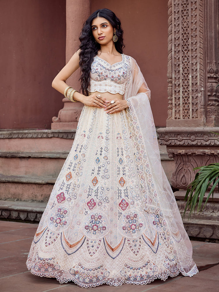 • Lehenga:- Made of premium quality Net fabric Full Flaire Semi-Stitched Lehenga With Sequins and stone and Coding work has a thread Embroidery work. Has a thread cutwork border on the hemline.