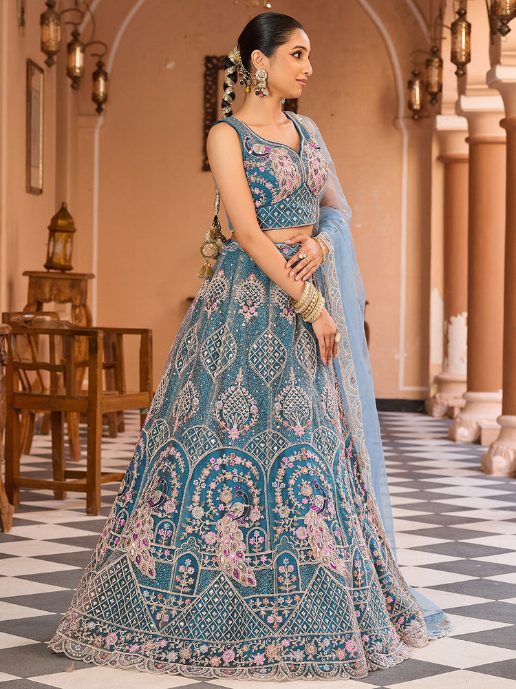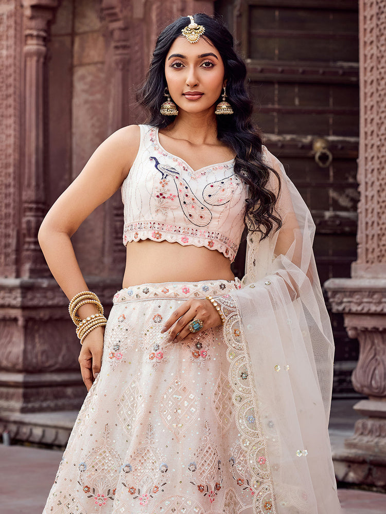 • Lehenga:- Made of premium quality Net fabric Full Flaire Semi-Stitched Lehenga With Sequins and stone and Coding work has a thread Embroidery work. Has a thread cutwork border on the hemline.