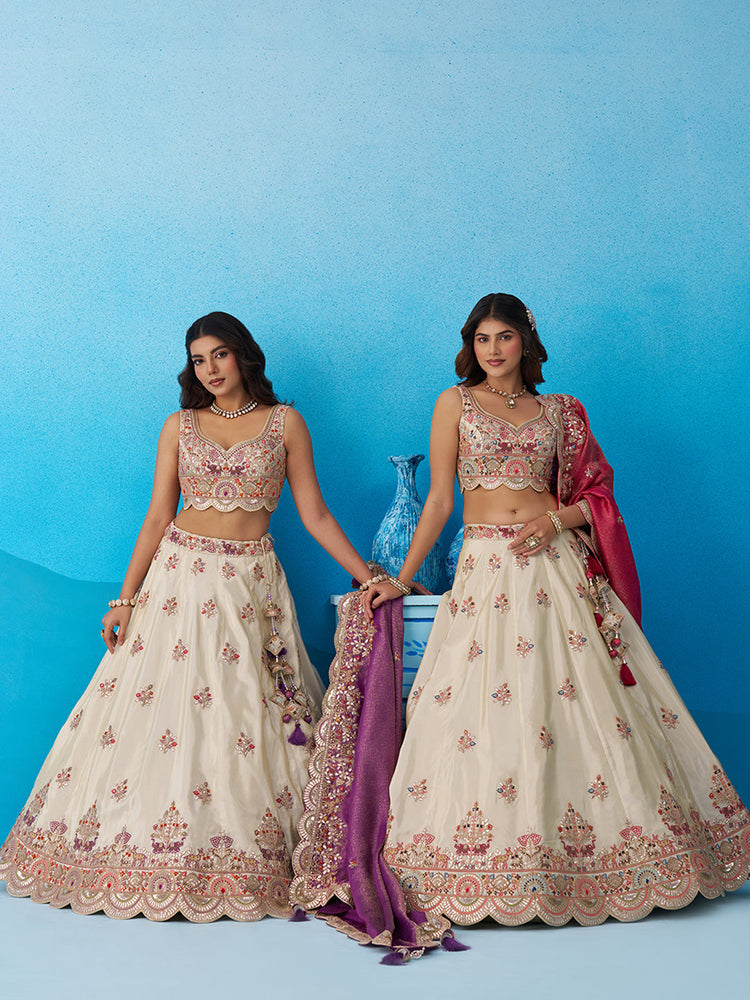 • Lehenga : Elegant semi-stitched lehenga set crafted in premium Cream Tissue fabric with heavy Sequins with embroidered beautiful gota work. The lehenga features a 3.5 meter flair with a colourful cut work heavy border on the hemline and is supported with double shantoon inner, can-can 12 & 18 inches and buckram 4 and 12 inches for a perfect shape.