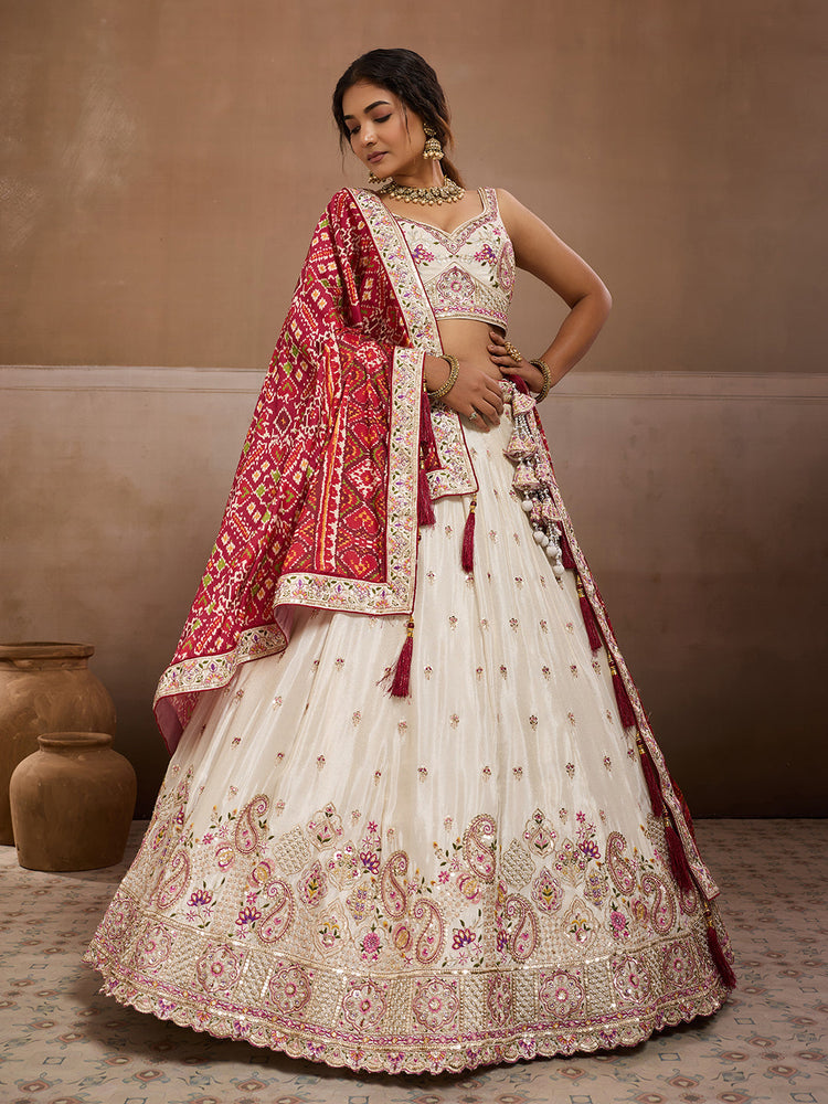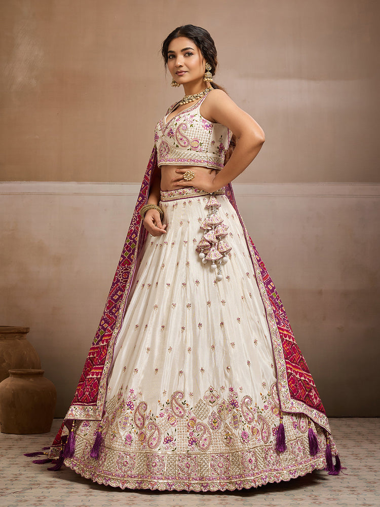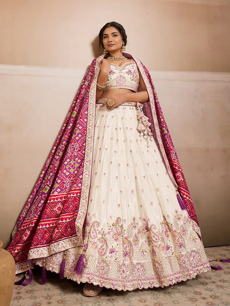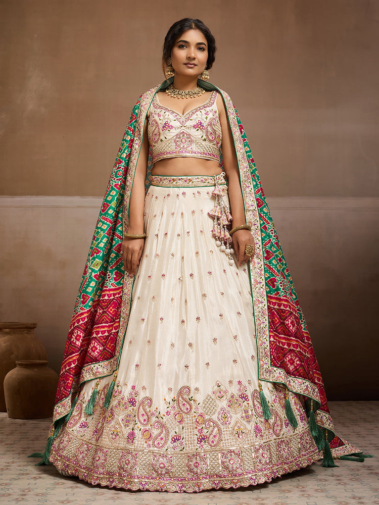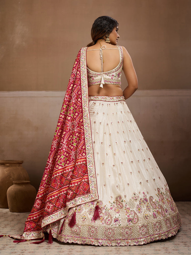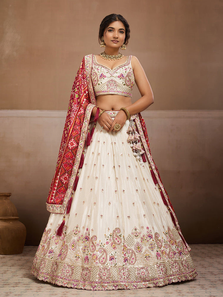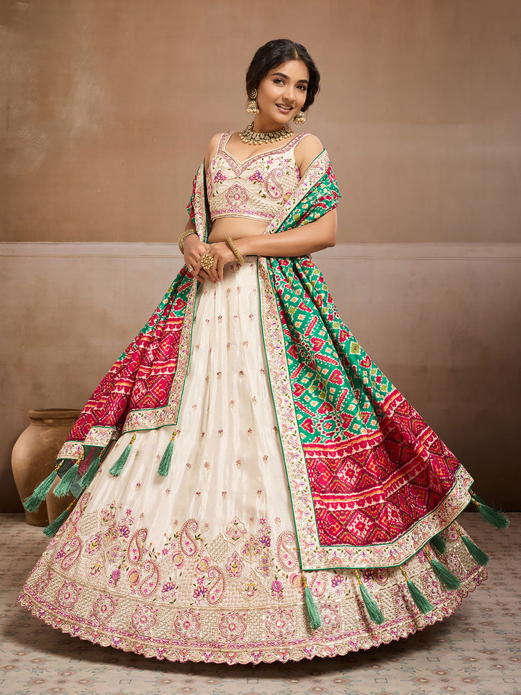 • Lehenga:- Made of premium quality Cream Color with Tissue fabric Full Flaire Semi-Stitched Lehenga With Sequins and Coding work has a Jari work. Has a thread border on the hemline.