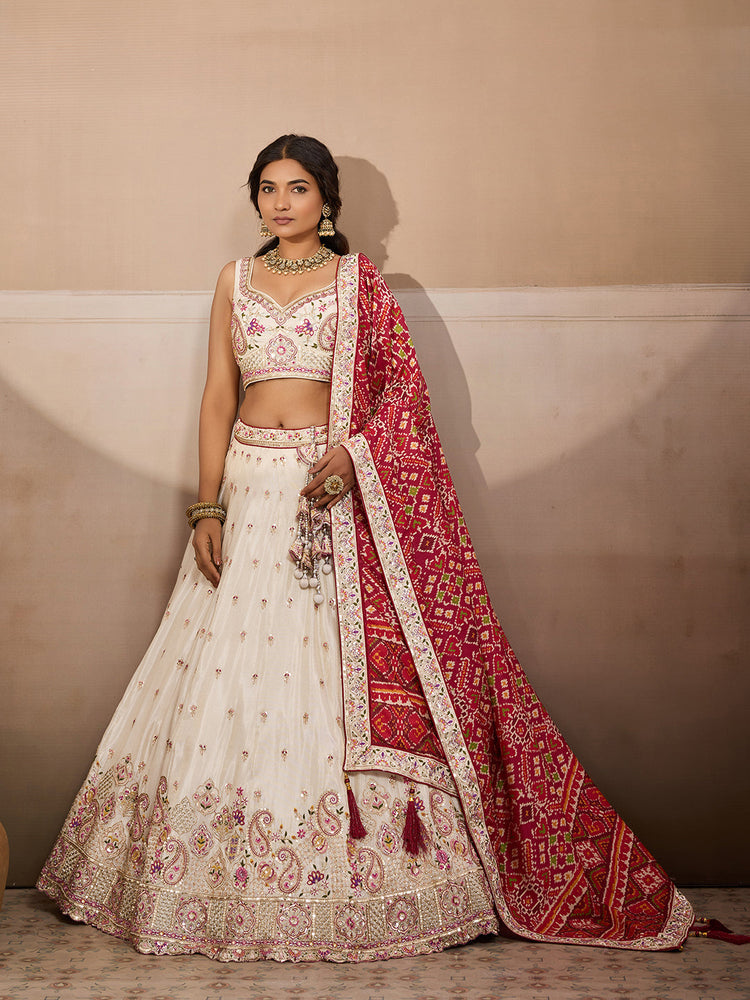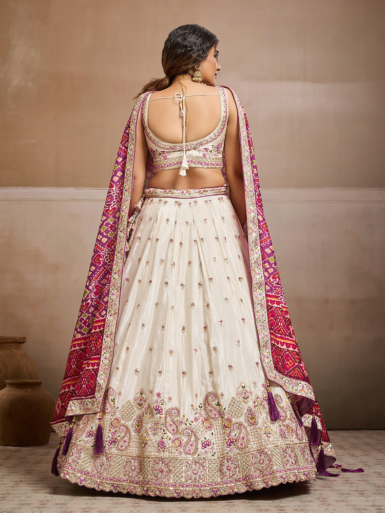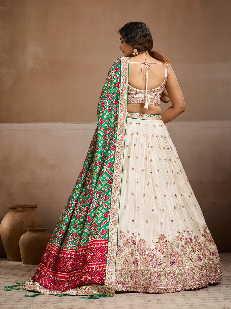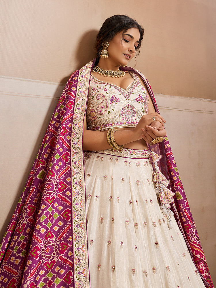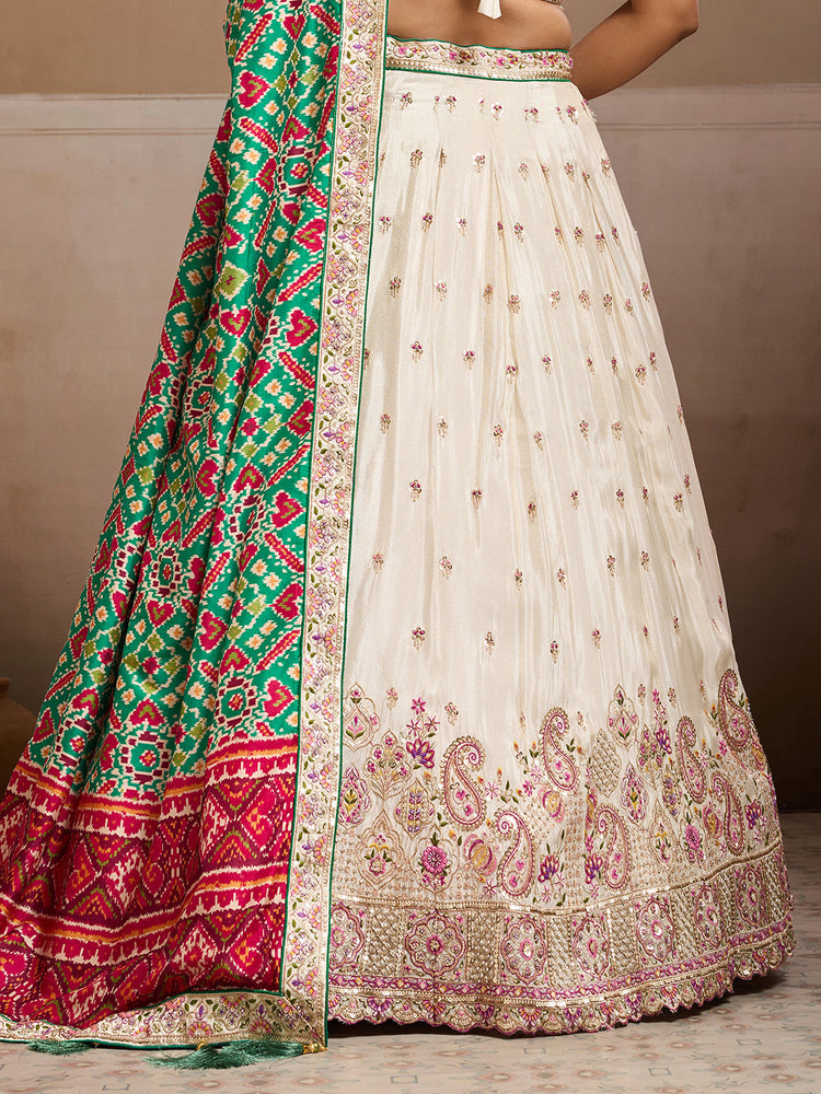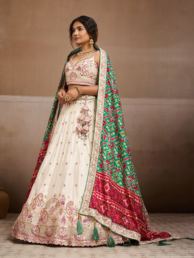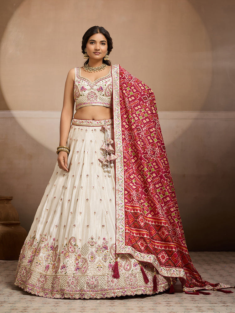 • Lehenga:- Made of premium quality Cream Color with Tissue fabric Full Flaire Semi-Stitched Lehenga With Sequins and Coding work has a Jari work. Has a thread border on the hemline.