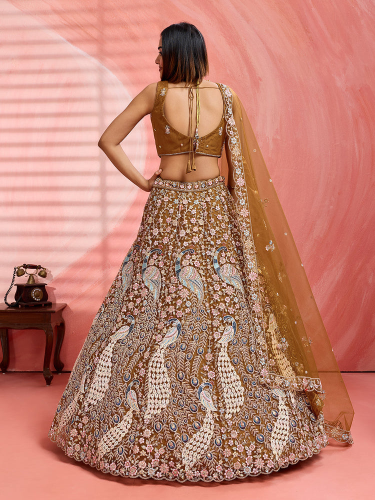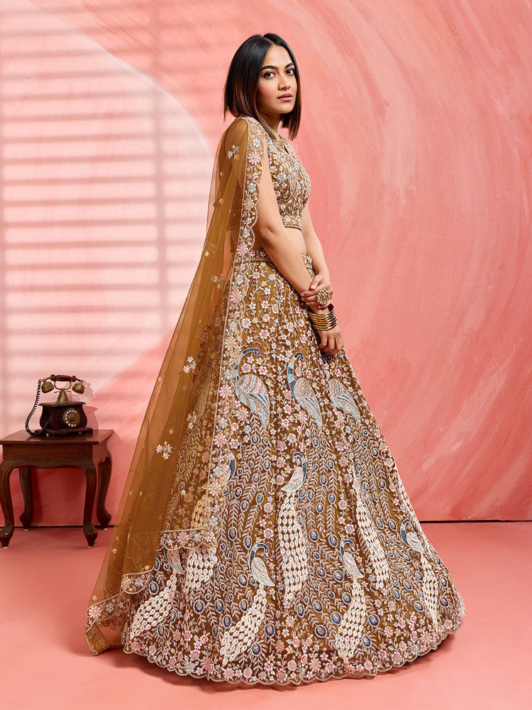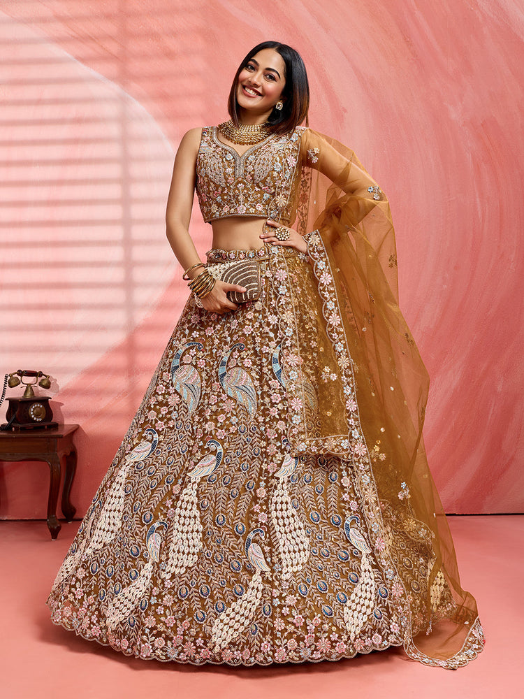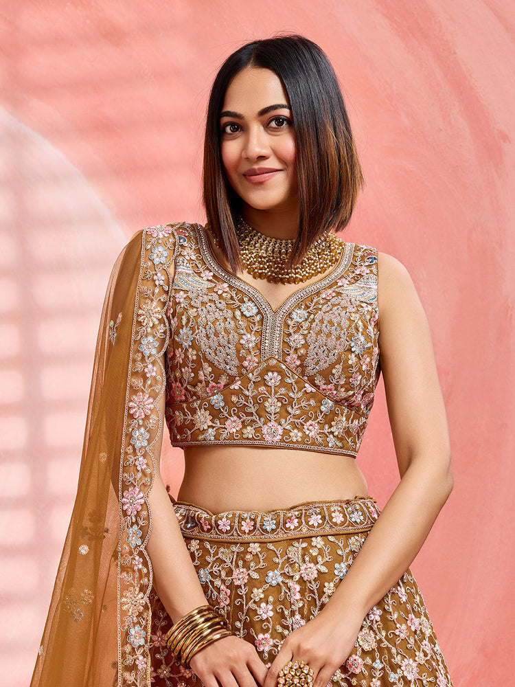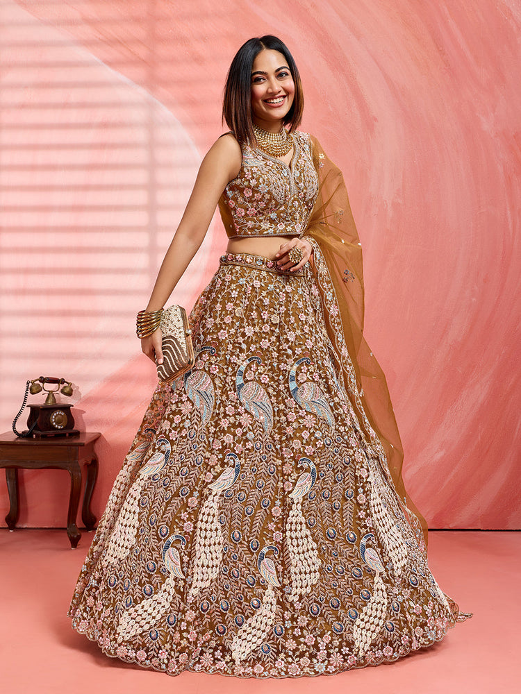 • Lehenga:- Made of premium quality Net fabric Full Flaire Semi-Stitched Lehenga With Sequins and stone and Coding work has a thread Embroidery work. Has a thread cutwork border on the hemline.