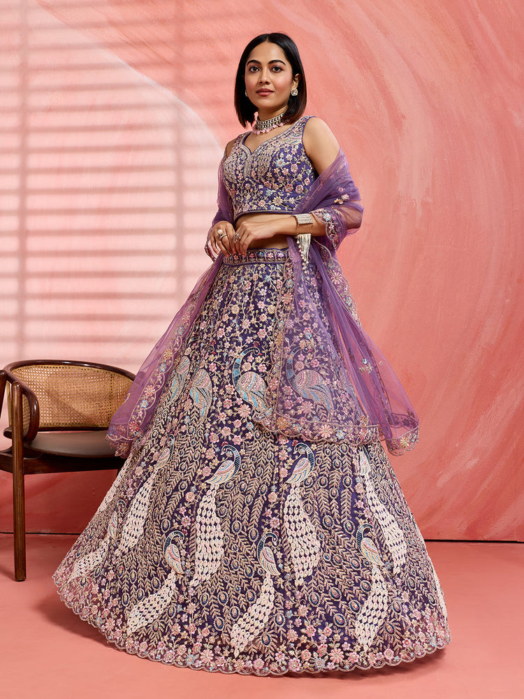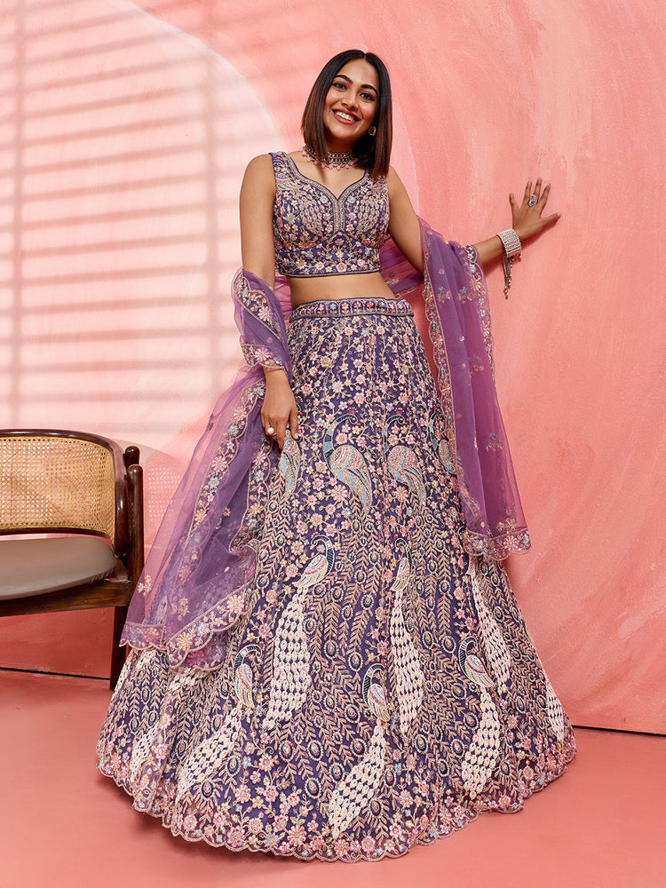 PURPLE - Net Fabric Sequins embroidery Semi-Stitched Lehenga & Unstitched Blouse With Dupatta