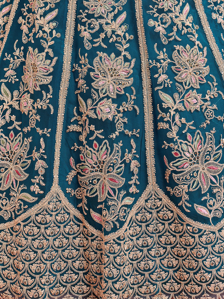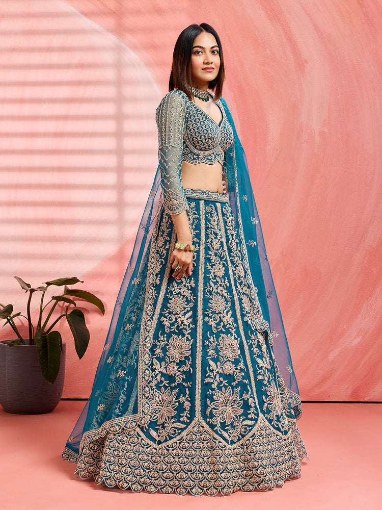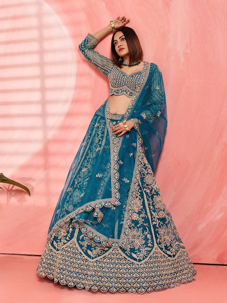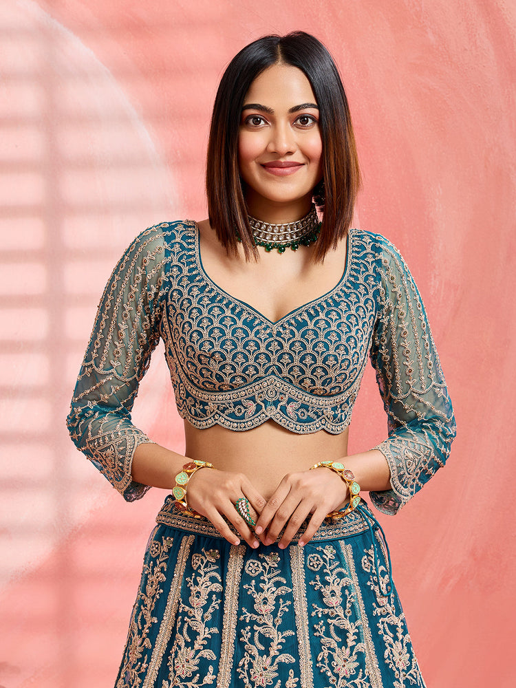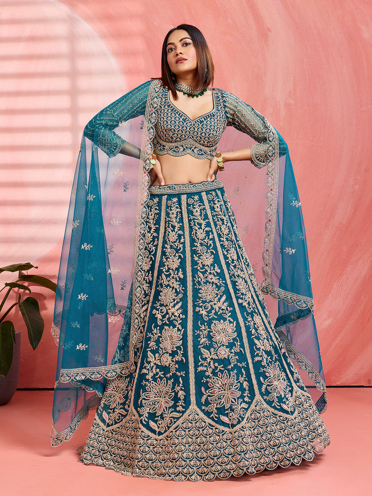 • Lehenga:- Made of premium quality Teal Color with Net fabric Full Flaire Semi-Stitched Lehenga With Sequins and stone and Coding work has a thread Embroidery work. Has a thread cutwork border on the hemline.
