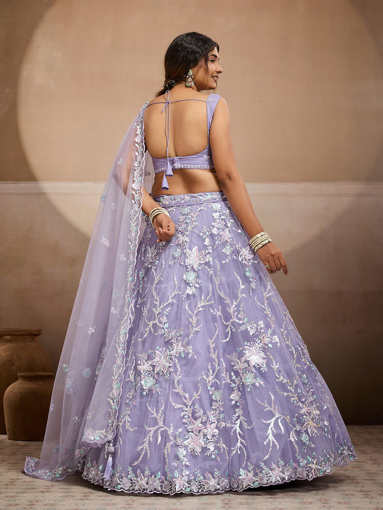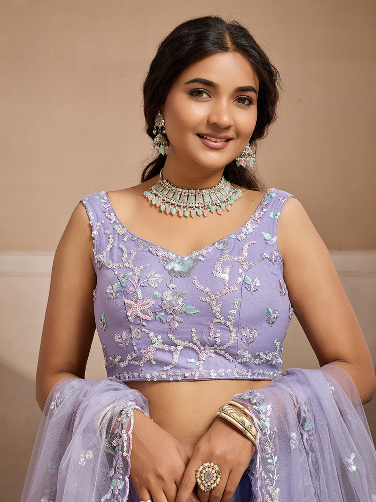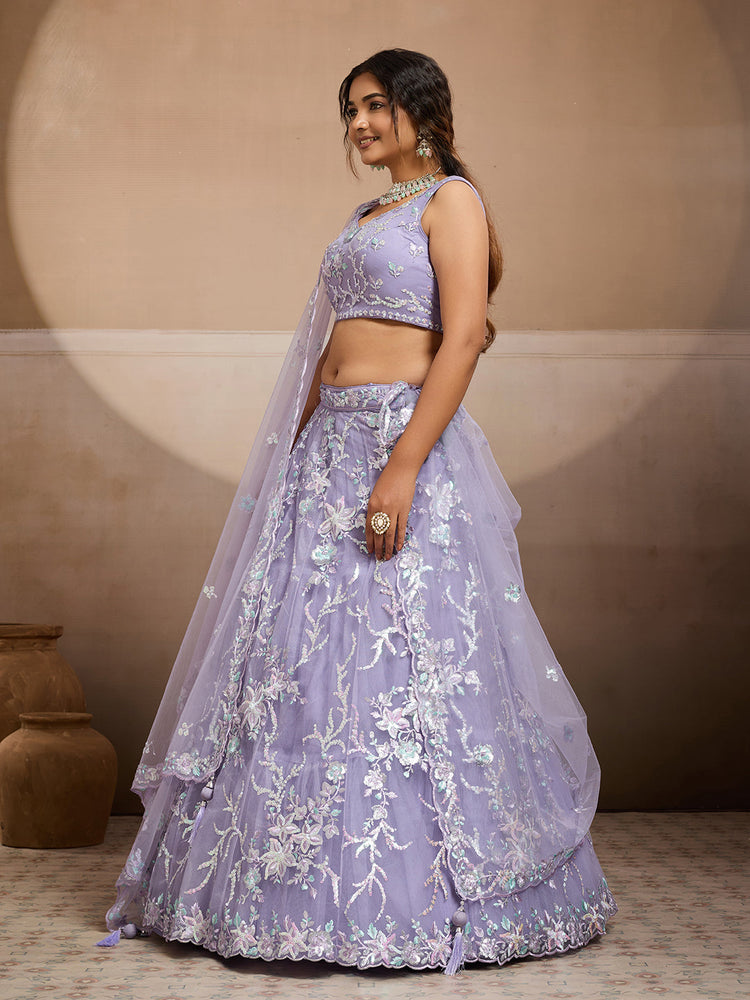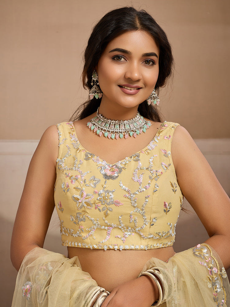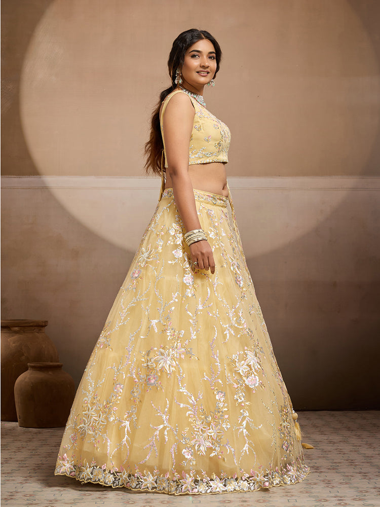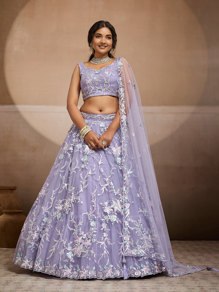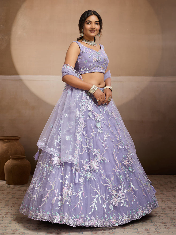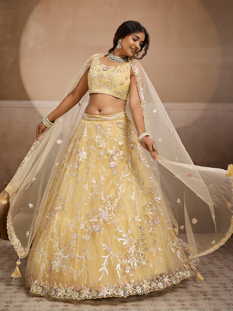 • Lehenga:- Made of premium quality Net fabric Full Flaire Semi-Stitched Lehenga With Sequins work has a thread Embroidery work. Has a thread cutwork border on the hemline.
