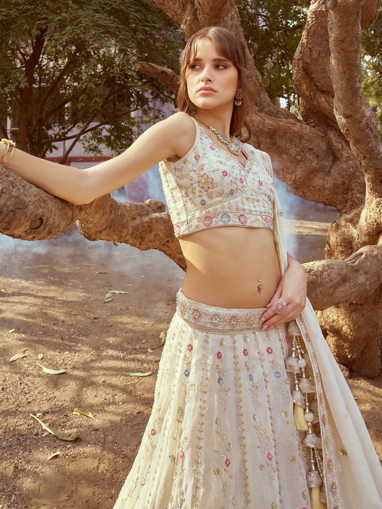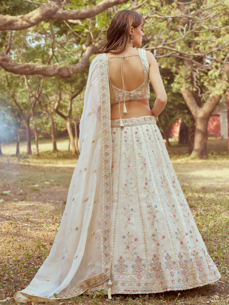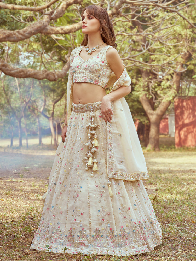 CREAM - Tissue Fabric embroidery with beads and stones work Semi-Stitched Lehenga choli & Dupatta