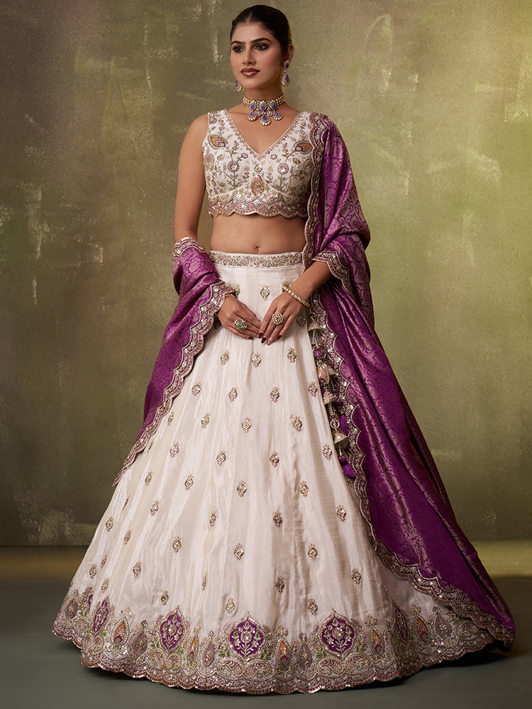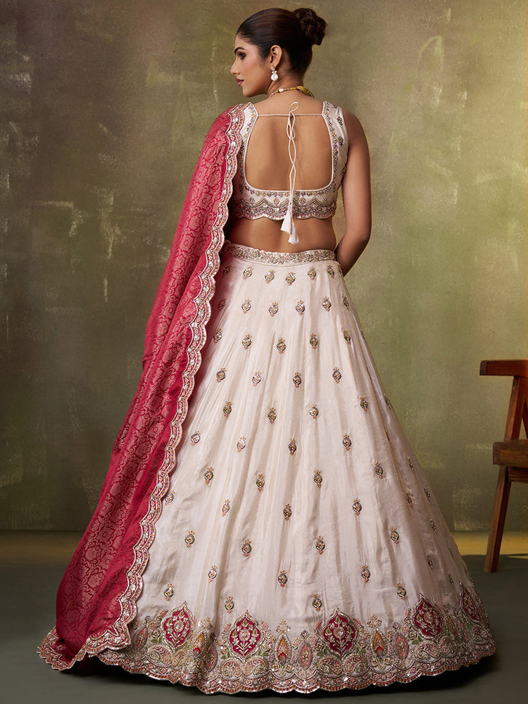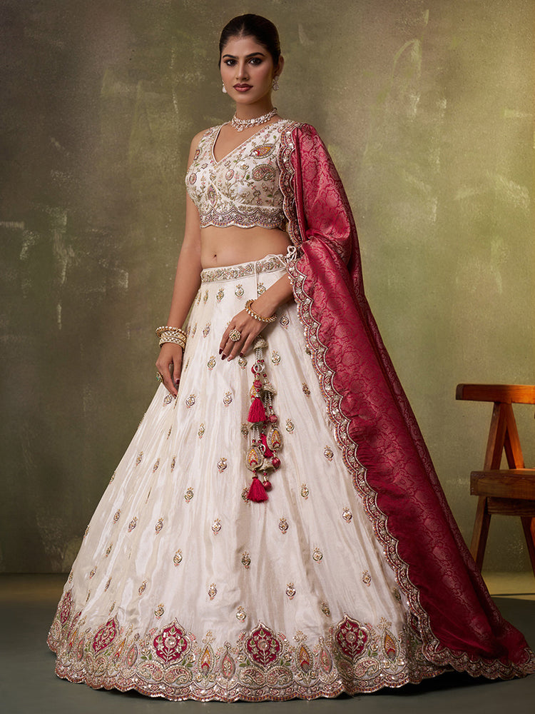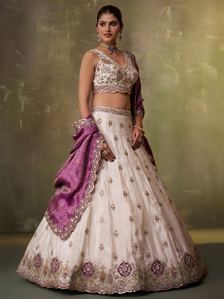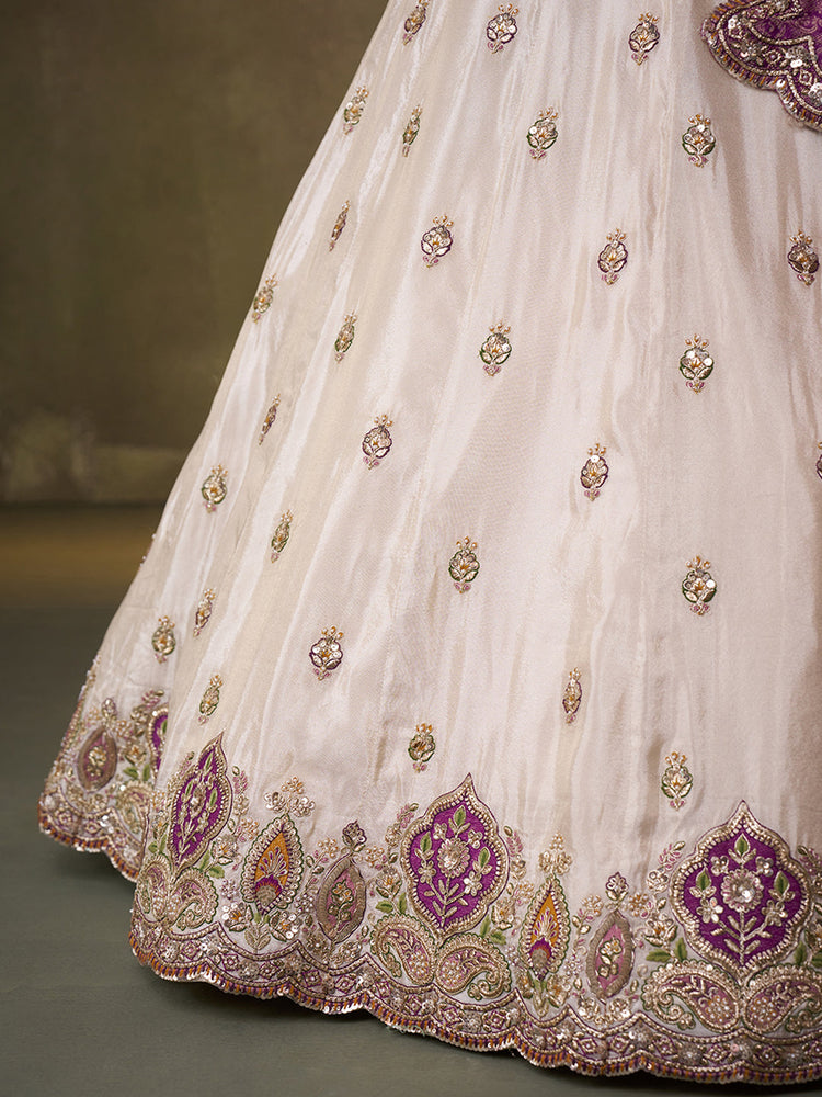 • Lehenga:- Made of premium quality Beige Tissue fabric Full Flair Semi-Stitched Lehenga With Moti, Sequinse and Coding work has a thread Embroidery work. Has a thread work border on the hemline.