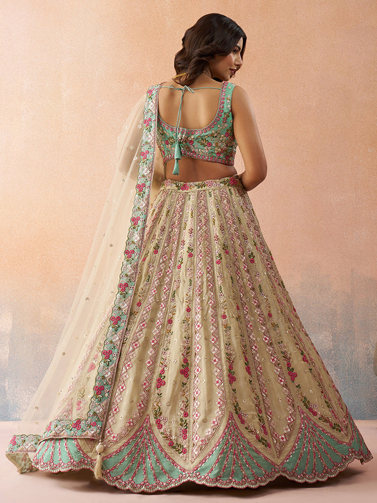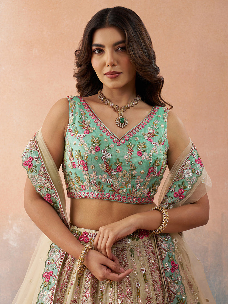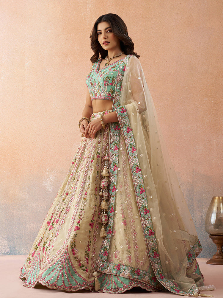 • Lehenga:- Made of premium quality with Tissue fabric Full Flaire Semi-Stitched Lehenga With Sequins and stone and Coding work has a thread Embroidery work. Has a thread cutwork border on the hemline.