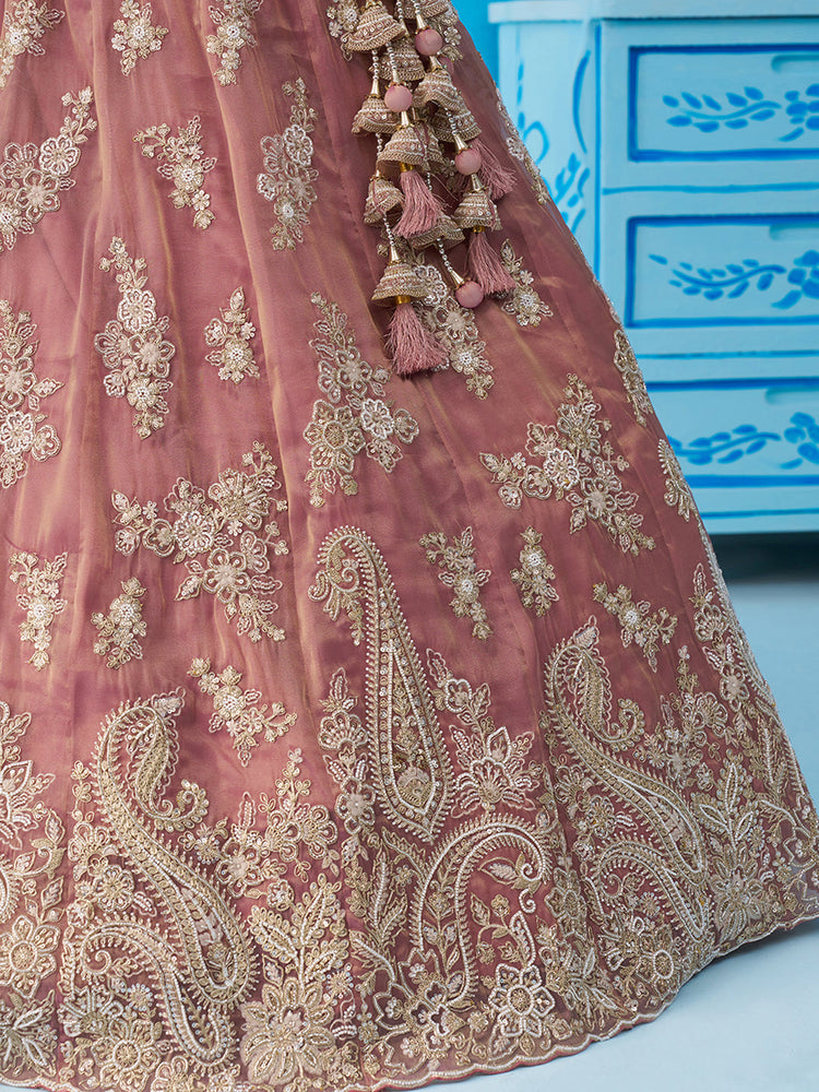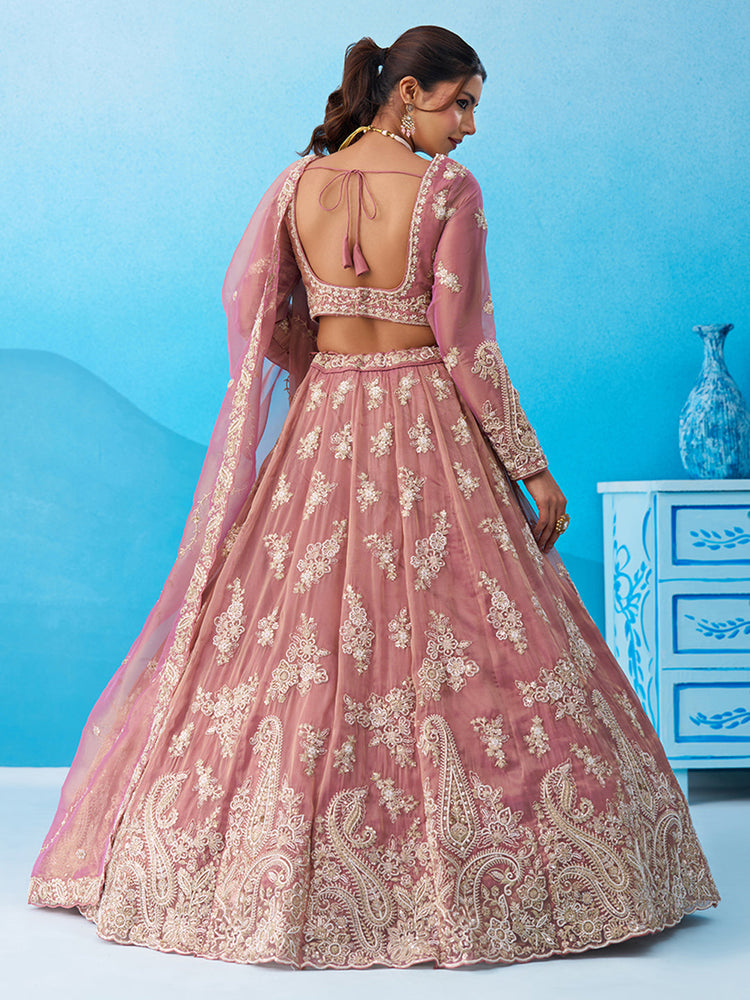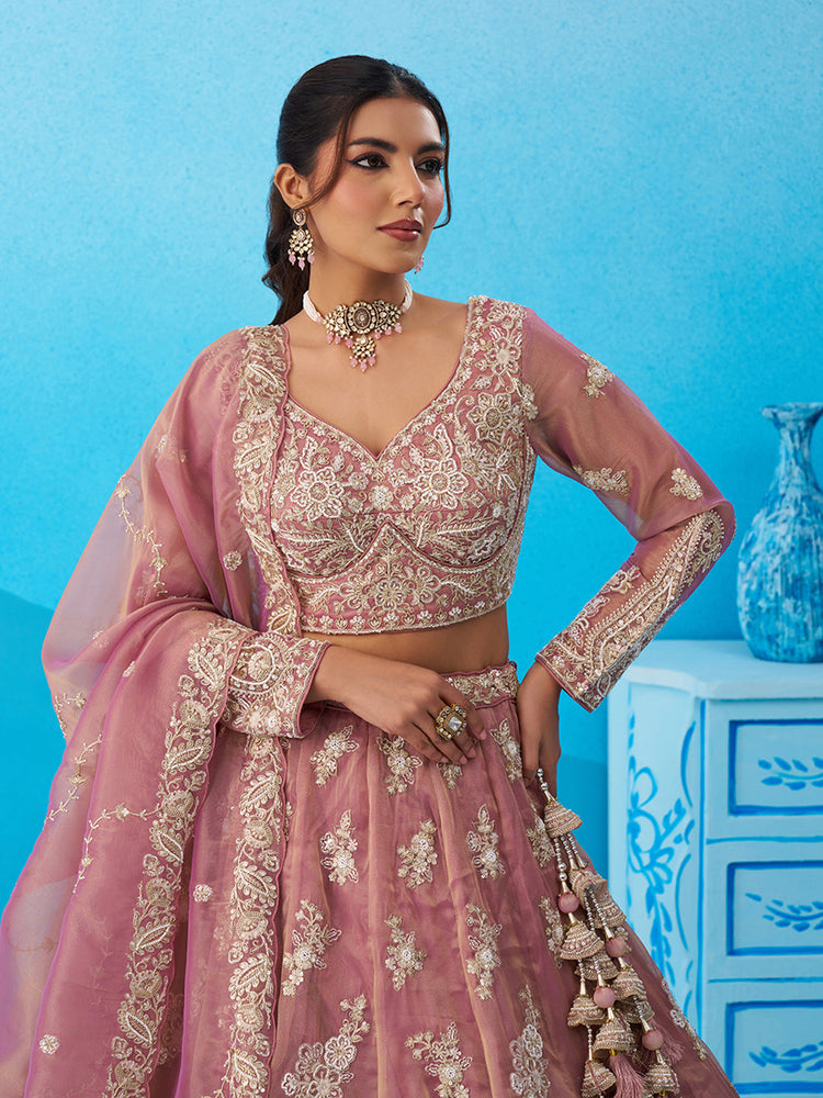 Pink Tissue Beads & Sequins Embroidered Semi-Stitched Lehenga Set