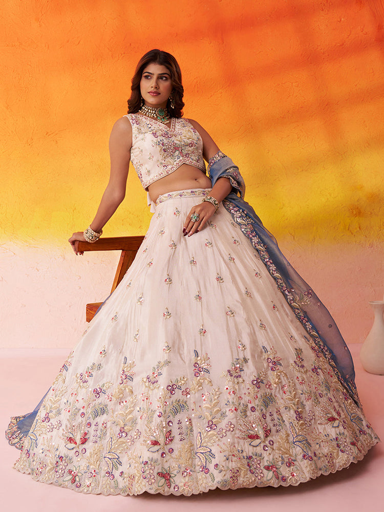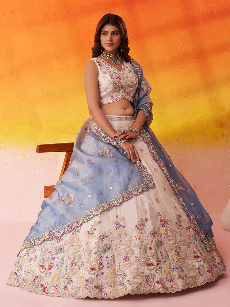 • Lehenga:- Made of premium quality Beige Tissue fabric Full Flair Semi-Stitched Lehenga With Moti, Sequinse and Coding work has a thread Embroidery work. Has a thread work border on the hemline.